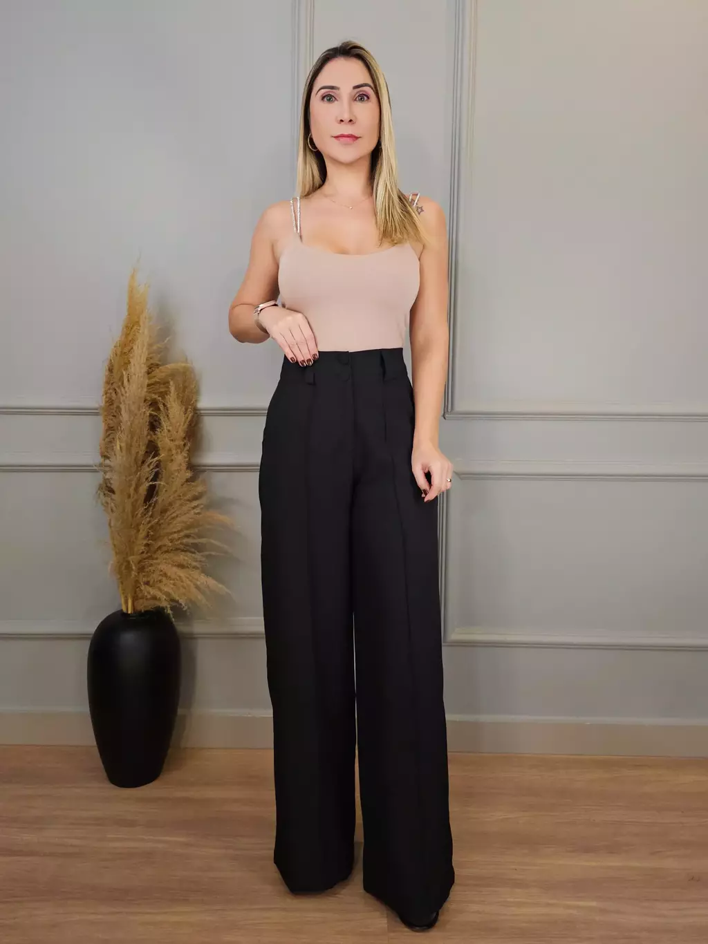 Calça pantalona de cintura alta. Esta calça é perfeita para quem busca um visual moderno e elegante. Seu design único, com modelagem ampla e cintura alta com botões duplos, valoriza a silhueta feminina e adiciona um toque de sofisticação ao look. Confeccionada em tecido leve e confortável, é ideal para diversas ocasiões, desde um evento casual até um ambiente de trabalho mais formal.