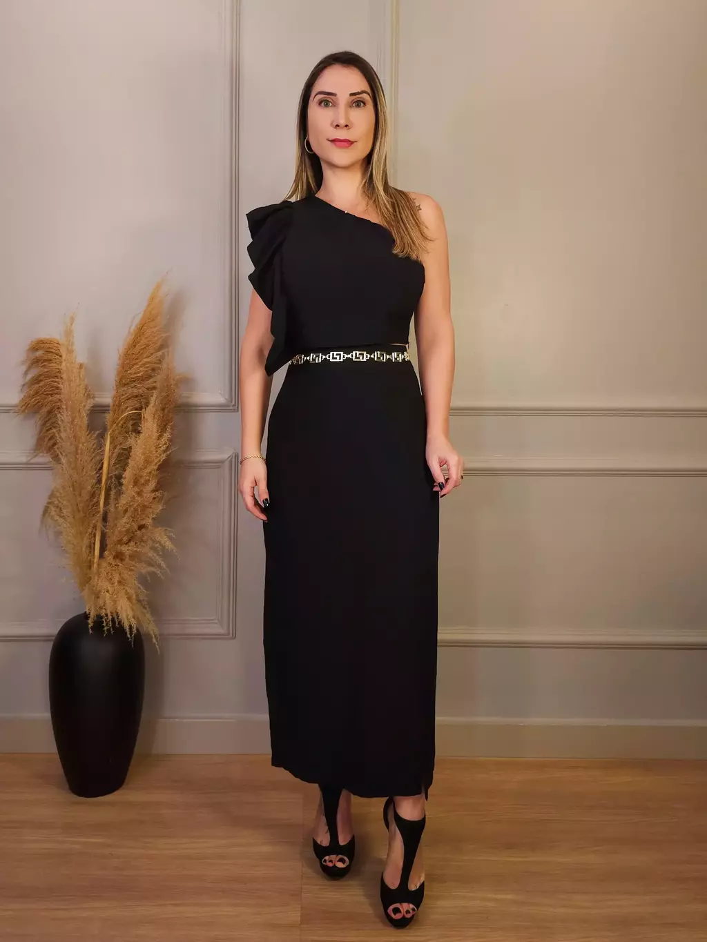 Conjunto de saia midi e cropped preto com um ombro só e detalhe de babado. Este conjunto é ideal para quem procura um visual elegante e sofisticado. Seu design assimétrico com um ombro só e babado, juntamente com a saia midi, realça a silhueta feminina e adiciona um toque de glamour ao look. Confeccionado em tecido fluido e confortável, é perfeito para eventos formais e ocasiões especiais.