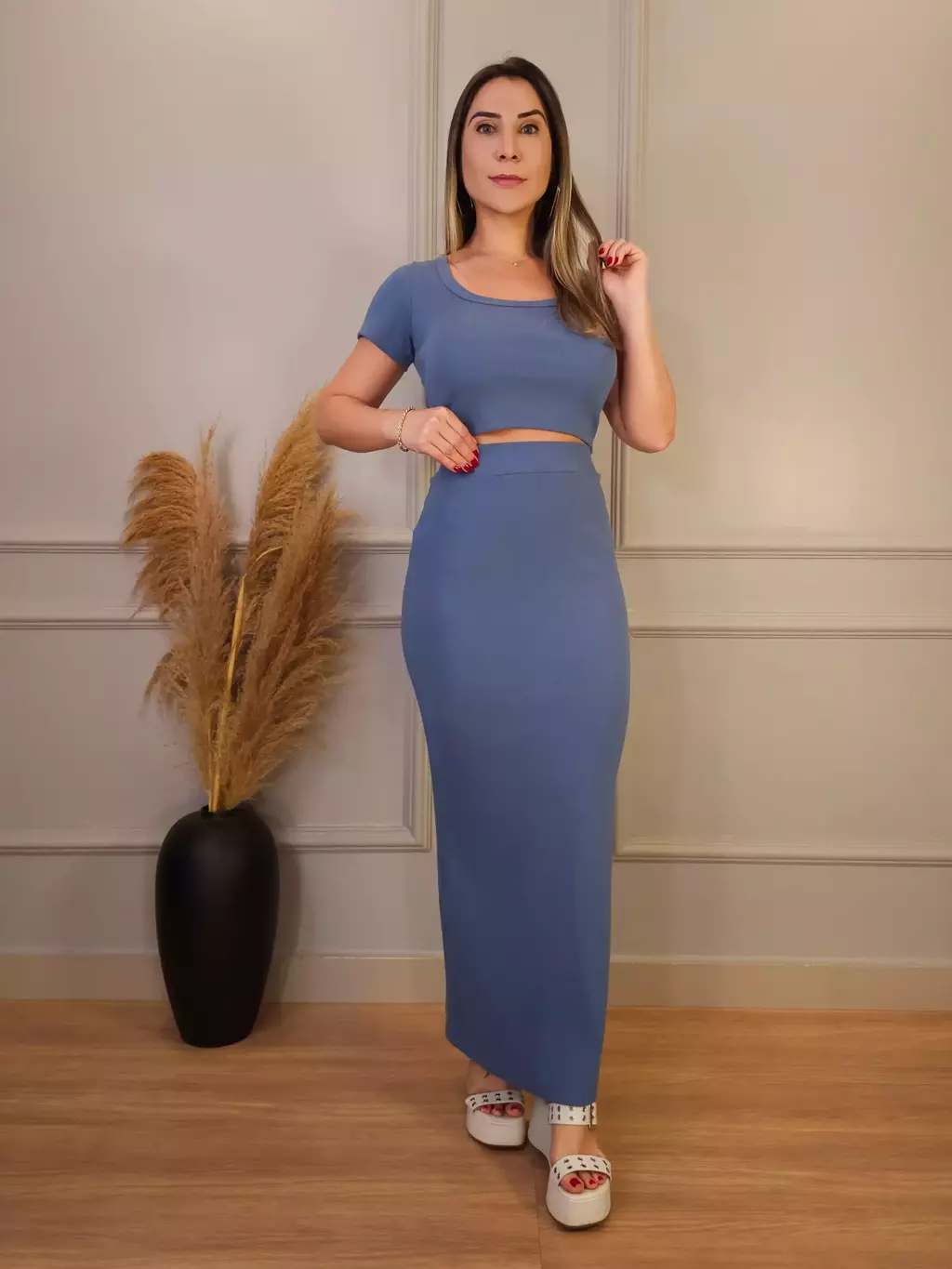Conjunto cropped e saia longa ribana. Este conjunto é perfeito para quem busca um visual moderno e elegante. Seu design único, com cropped de manga curta e saia longa, valoriza a silhueta feminina e adiciona um toque de sofisticação ao look. Confeccionado em tecido leve e confortável, é ideal para diversas ocasiões, desde um evento casual até um jantar mais formal.