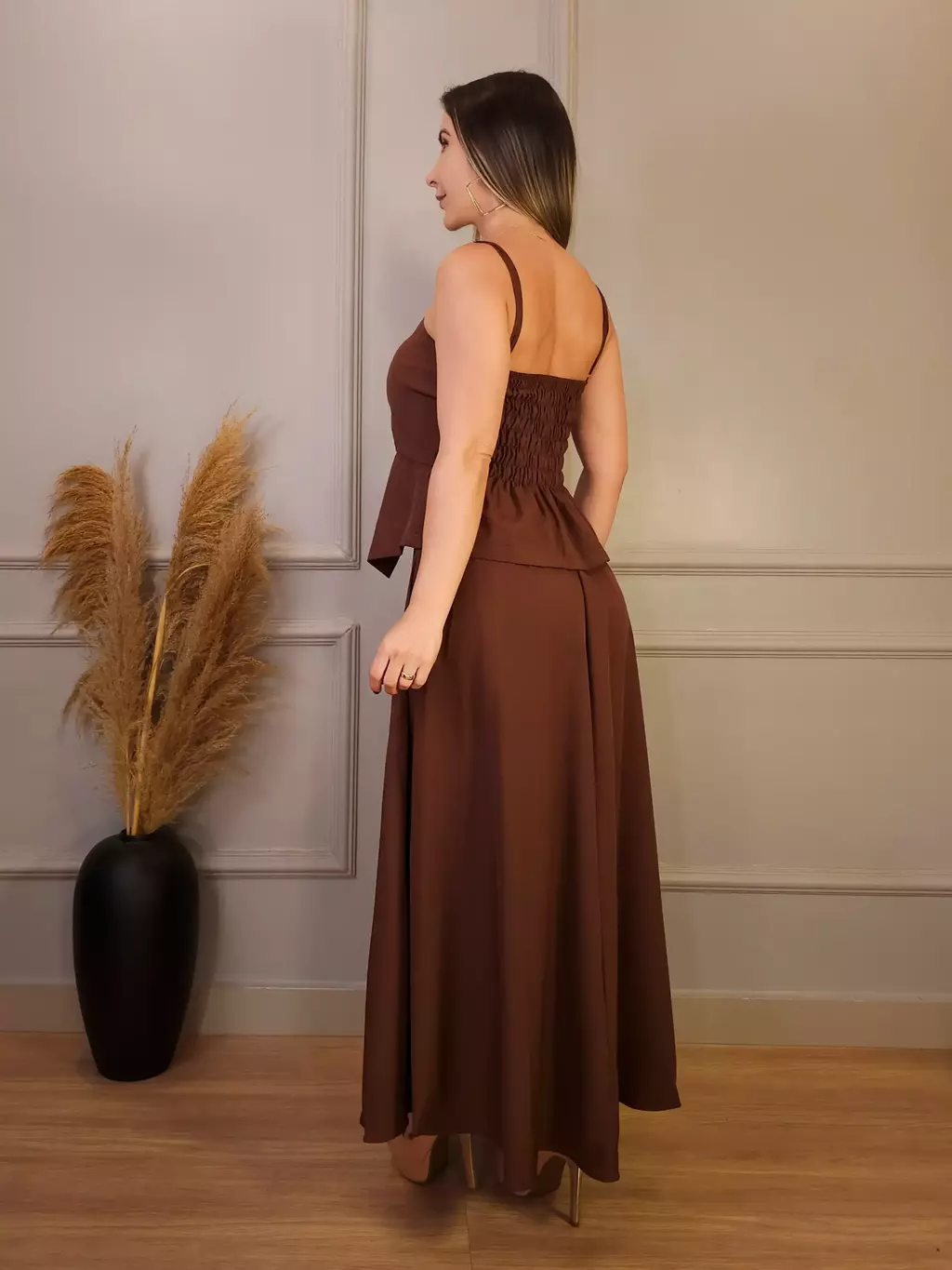 Conjunto de saia longa com blusa peplum. Este conjunto é perfeito para quem busca um visual elegante e moderno. Seu design único, com alças finas e um corte especial no busto, valoriza o colo e adiciona um toque de sofisticação ao look. A blusa com modelo peplum acrescenta charme ao look. Confeccionado em tecido leve e confortável, é ideal para diversas ocasiões, desde um evento formal até um jantar especial.