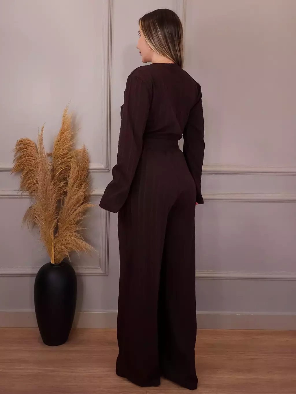 Conjunto de blusa manga longa e calça pantalona no tecido moletinho texturizado. Este conjunto é a peça perfeita para quem busca conforto e estilo. Seu design moderno, com calça de corte alongado e elástico na cintura, valoriza a silhueta e proporciona um visual elegante e despojado. A blusa com decote redondo e mangas longas complementam o conjunto. Confeccionado em tecido texturizado e confortável, é ideal para diversas ocasiões, desde um dia de trabalho até um happy hour com as amigas.