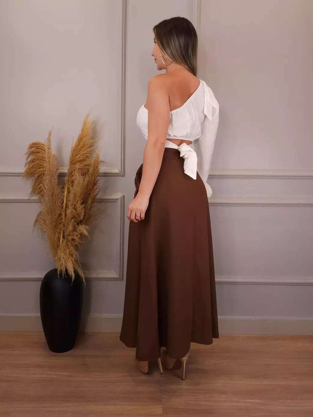 Cropped elegante de um ombro só com detalhe de laço no ombro. Este cropped é perfeito para quem busca um visual sofisticado e moderno. Seu design assimétrico com manga longa bufante em um dos lados e ombro à mostra valoriza a silhueta feminina e adiciona um toque de glamour ao look. Confeccionado em tecido leve e confortável, é ideal para diversas ocasiões, desde um evento especial até um encontro casual chic.