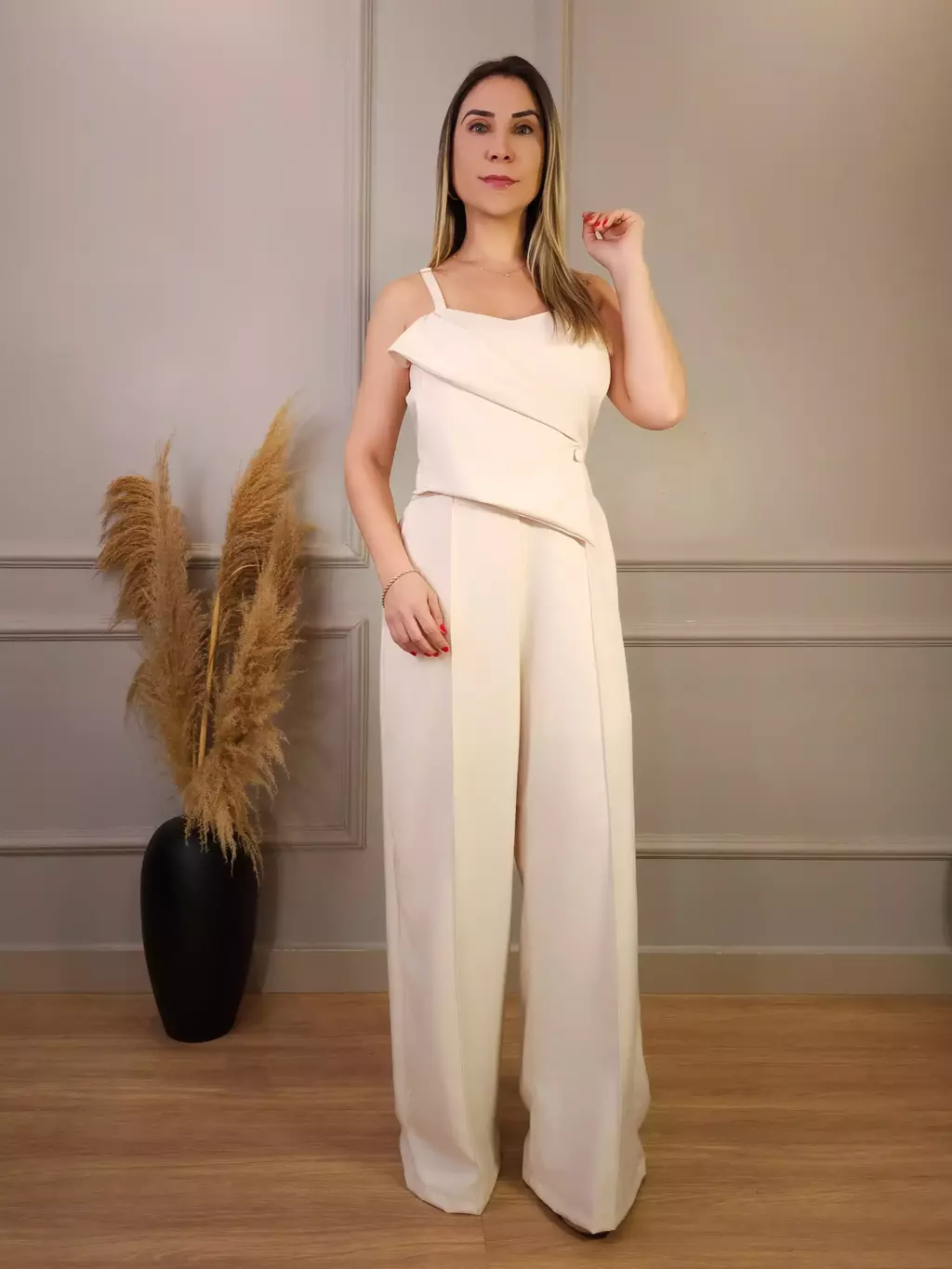Macacão pantalona com detalhe transpassado assimétrico no busto. Este macacão é perfeito para quem busca um visual moderno e elegante. Seu design único, com alças finas e detalhe transpassado no busto, valoriza a silhueta feminina e adiciona um toque de sofisticação ao look. Confeccionado em tecido leve e confortável, é ideal para diversas ocasiões, desde um evento casual até um jantar mais formal.
