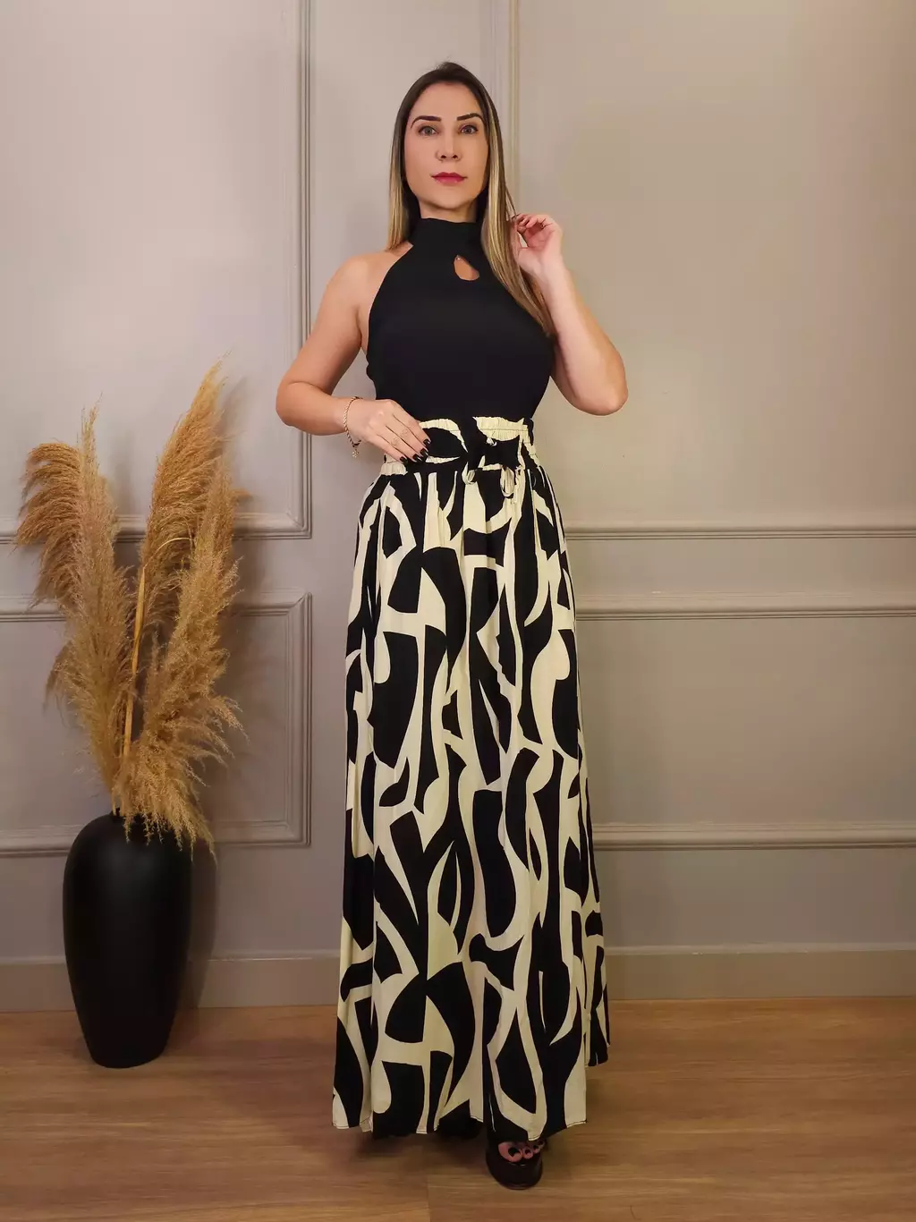 Saia longa com estampa abstrata em preto e branco. Esta saia é perfeita para quem busca um visual moderno e estiloso. Seu design único, com uma estampa abstrata marcante, valoriza a silhueta feminina e adiciona um toque de personalidade ao look. Confeccionada em tecido leve e confortável, com cintura alta e elástico ajustável, é ideal para diversas ocasiões, desde um passeio casual até um evento mais descontraído.