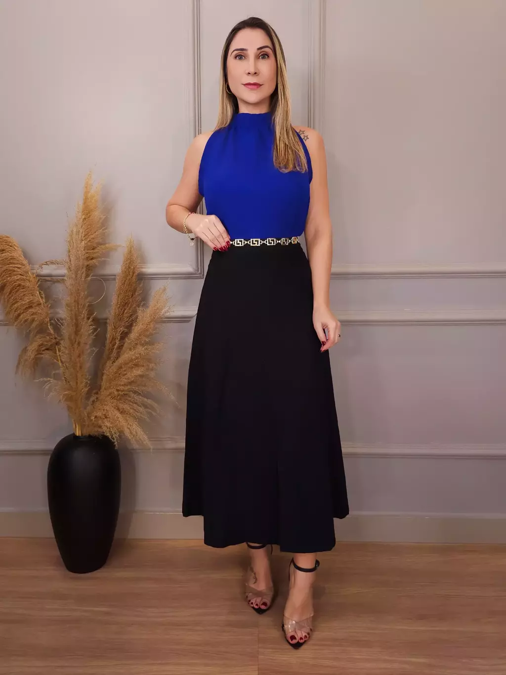 Saia midi evasê preta com cintura marcada. Esta saia é perfeita para quem busca um visual elegante e versátil. Seu design clássico, com corte evasê e cintura alta marcada por um cinto dourado, valoriza a silhueta feminina e adiciona um toque de sofisticação ao look. Confeccionada em tecido de alfaiataria leve e confortável, é ideal para diversas ocasiões, desde um dia de trabalho até um evento social.