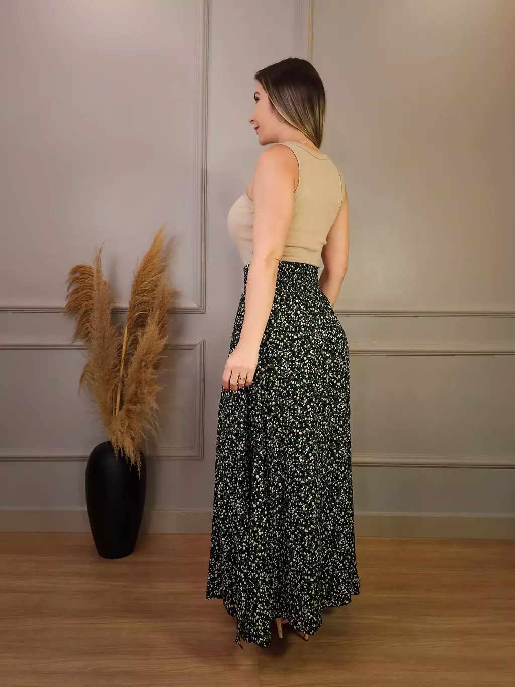 Combinações: Combine com blusas de cores neutras, como branco, preto ou bege, para destacar a estampa da saia. Para um look mais casual, combine com uma camiseta básica e tênis. Para um visual mais elegante, aposte em uma blusa de seda e sandálias de salto alto. Acessórios delicados complementam o visual.