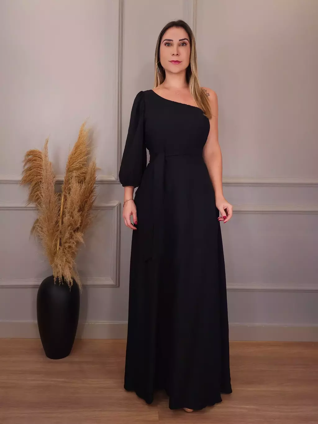 Vestido longo com design de um ombro só. Este vestido é perfeito para quem busca um visual sofisticado e elegante. Seu design assimétrico, com uma manga longa bufante e faixa na cintura, valoriza a silhueta feminina e adiciona um toque de glamour ao look. Confeccionado em tecido leve e confortável, é ideal para eventos formais, festas e ocasiões especiais.