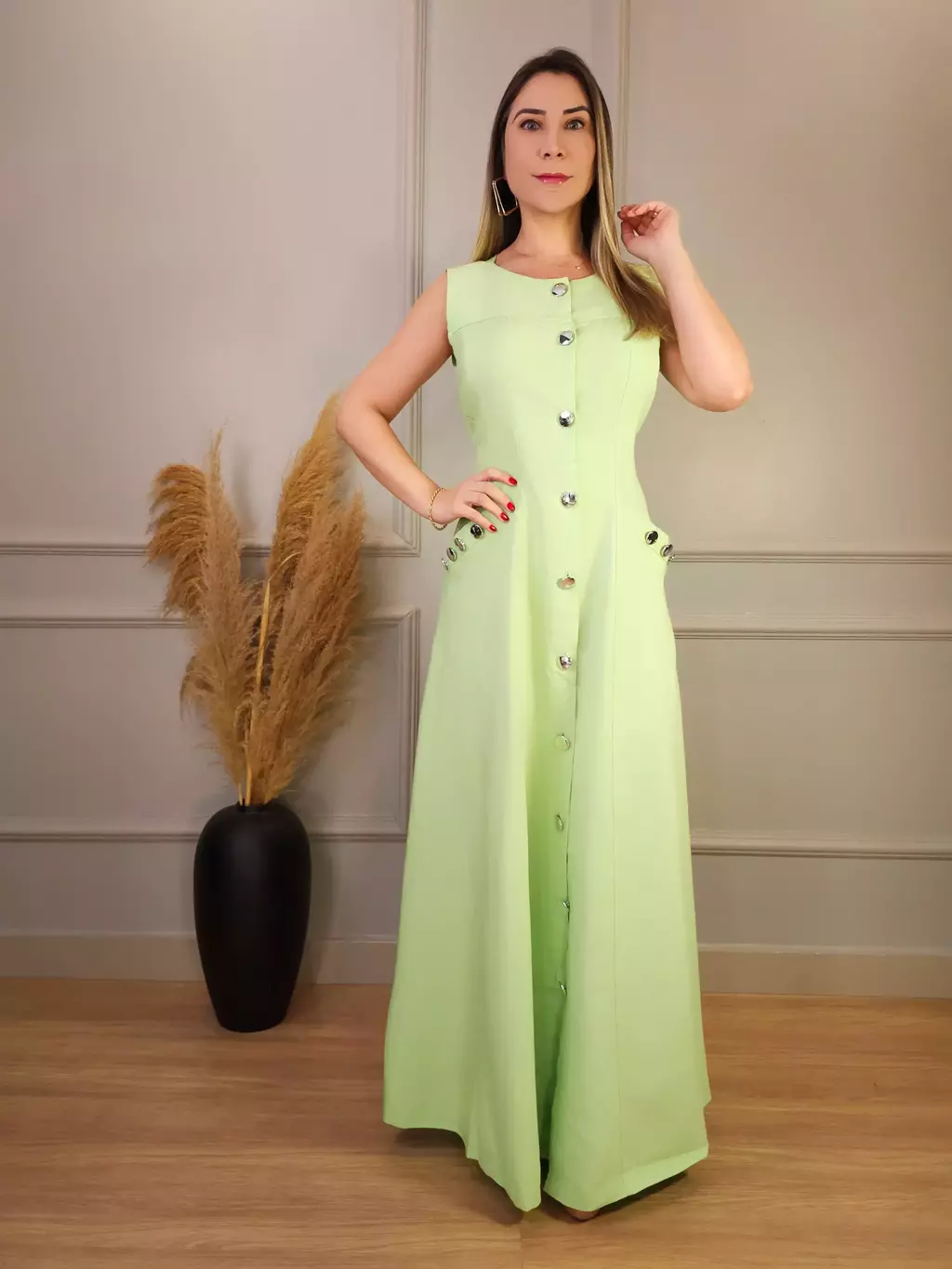 Vestido longo preto com botões frontais prateados. Este vestido é ideal para quem procura um visual sofisticado e atemporal. Seu design elegante, com modelagem acinturada e botões prateados que percorrem toda a extensão frontal e os bolsos, alonga a silhueta e confere um toque de charme ao look. Confeccionado em tecido encorpado e de bom caimento, é perfeito para diversas ocasiões, desde um evento formal até um encontro casual-chic.