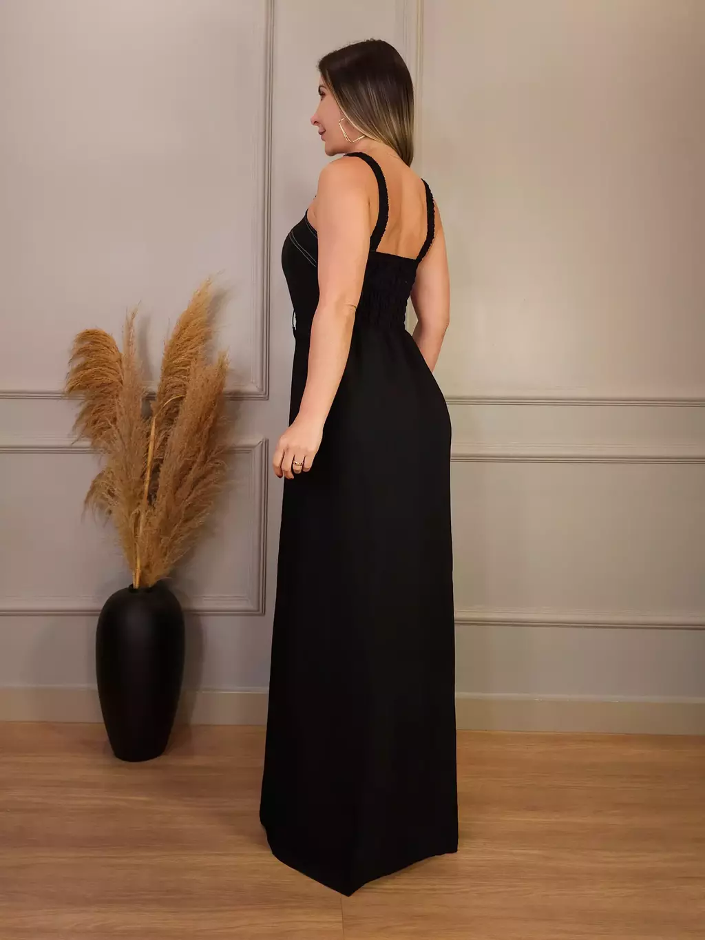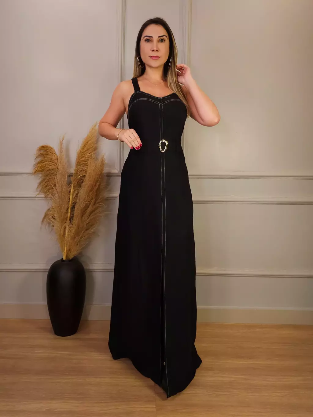 Vestido longo com cinto e fenda frontal. Este vestido é perfeito para quem busca um visual elegante e sofisticado. Seu design com alças médias, cinto com fivela dourada e fenda frontal, valoriza a silhueta feminina e adiciona um toque de modernidade ao look. Confeccionado em tecido leve e confortável, é ideal para diversas ocasiões, desde um evento casual chique até um jantar mais formal.