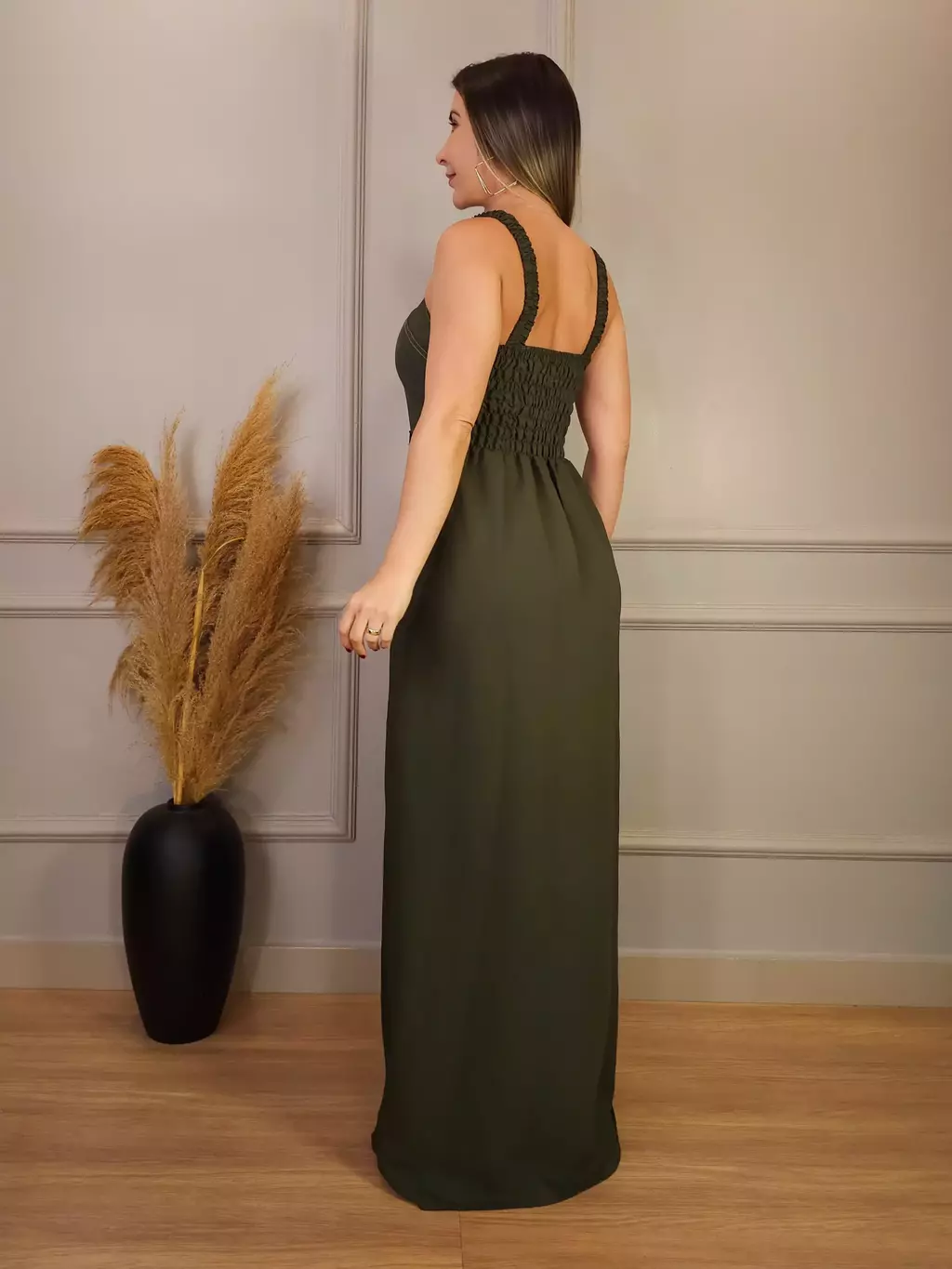 Vestido longo com cinto e fenda frontal. Este vestido é perfeito para quem busca um visual elegante e sofisticado. Seu design com alças médias, cinto com fivela dourada e fenda frontal, valoriza a silhueta feminina e adiciona um toque de modernidade ao look. Confeccionado em tecido leve e confortável, é ideal para diversas ocasiões, desde um evento casual chique até um jantar mais formal.