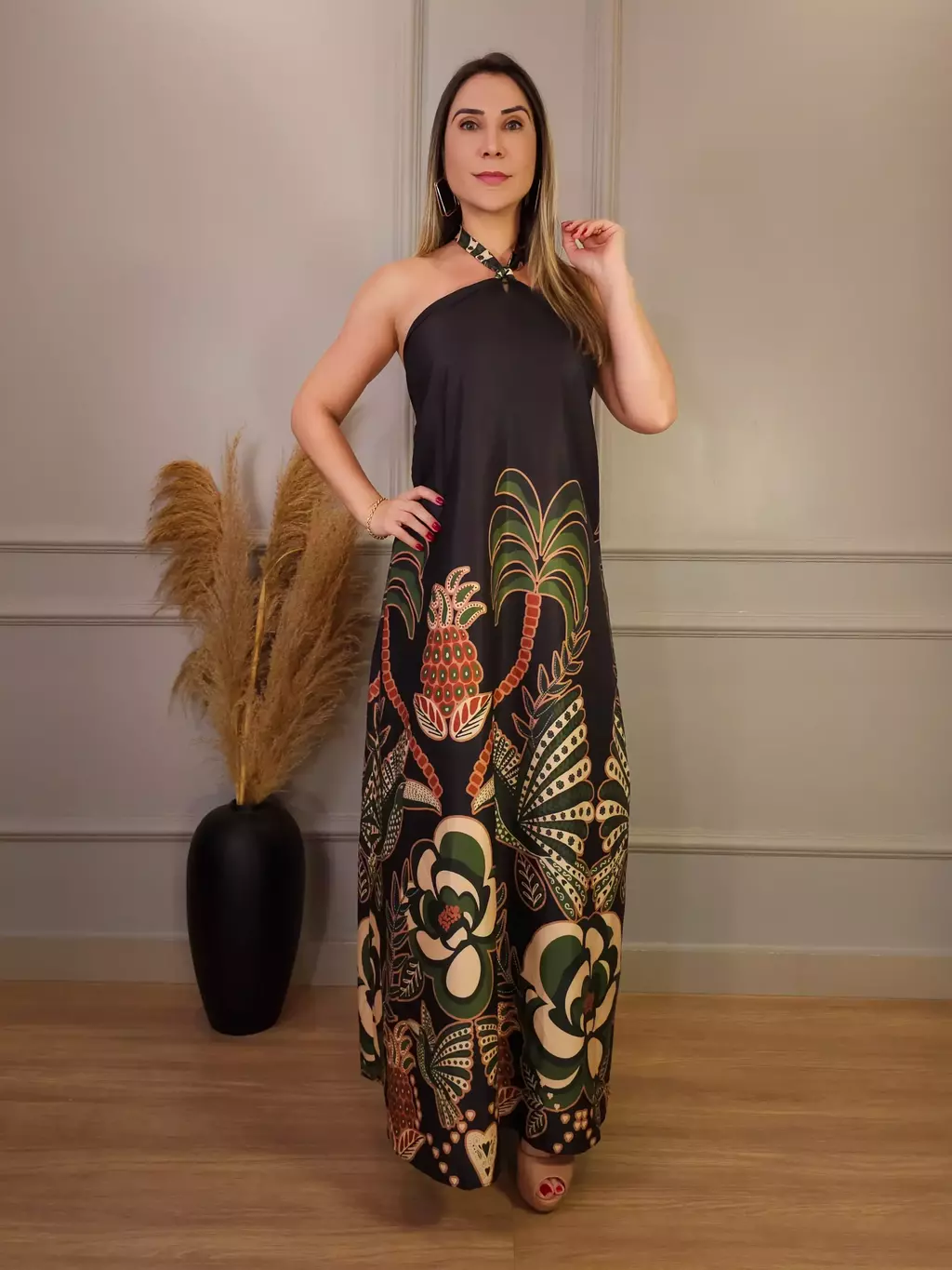 Vestido longo preto estampado com decote frente única. Este vestido é perfeito para quem busca um visual elegante e confortável. Seu design único, com estampas em tons de verde e marrom, valoriza a silhueta feminina e adiciona um toque de sofisticação ao look. Confeccionado em tecido leve e confortável, é ideal para diversas ocasiões, desde um evento casual até um jantar mais formal.