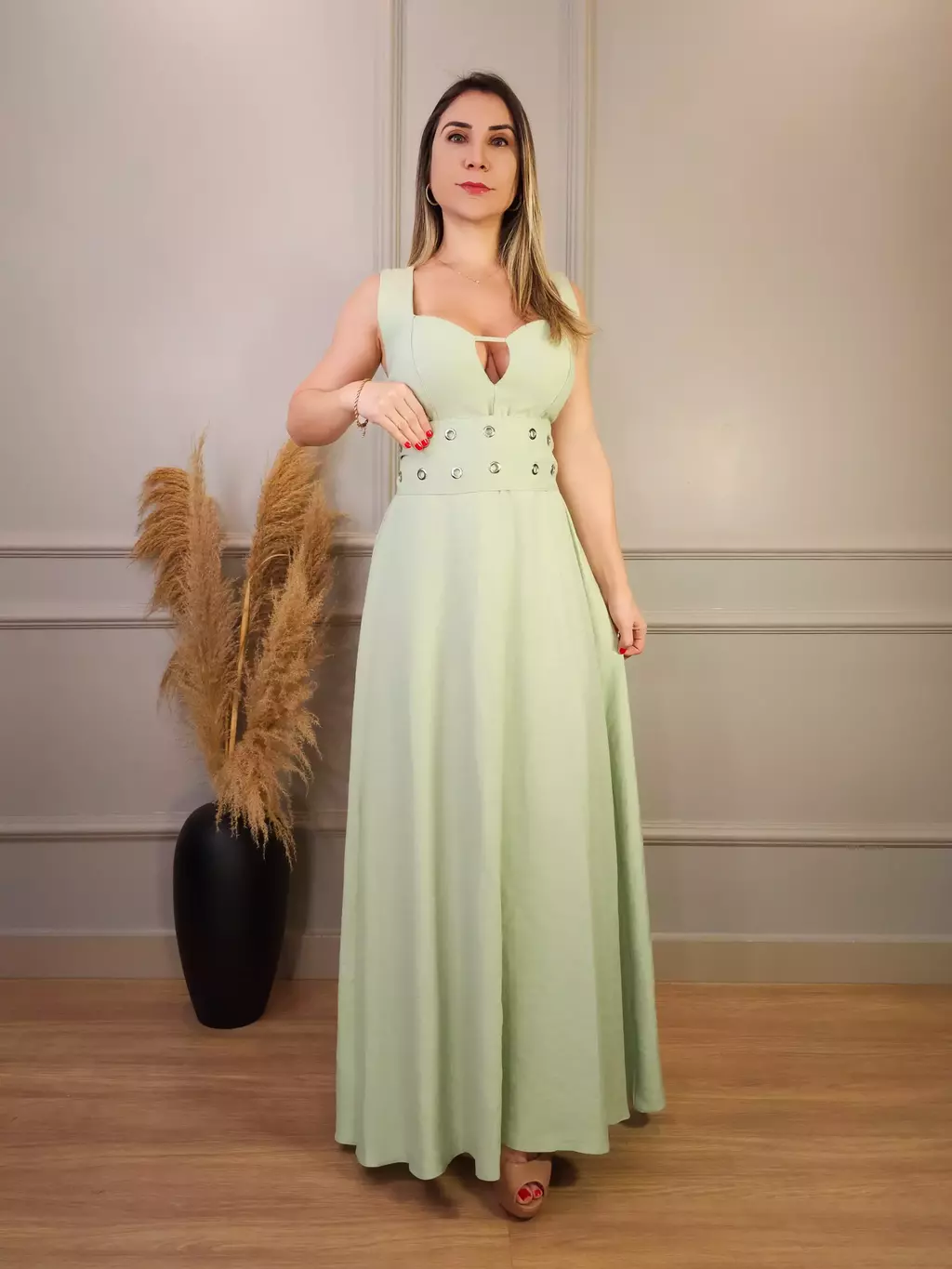 Vestido longo com detalhe de recorte no decote e faixa na cintura com ilhoses. Este vestido é perfeito para quem busca um visual elegante e moderno. Seu design único, com um sutil recorte no decote e faixa que define a cintura, valoriza a silhueta feminina e adiciona um toque de sofisticação ao look. Confeccionado em tecido leve e confortável, é ideal para diversas ocasiões, desde um evento social até um jantar especial.