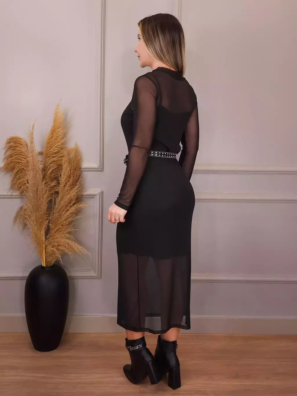 Vestido midi preto com sobreposição em tule. Este vestido combina modernidade e sofisticação, perfeito para diversas ocasiões. A sobreposição em tule com mangas longas adiciona um toque de mistério e elegância, enquanto o vestido interno garante conforto e cobertura. O cinto marcando a cintura valoriza a silhueta, criando um visual impecável. Ideal para eventos noturnos, festas ou mesmo um jantar especial.